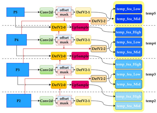 The P2, P3, P4, and P5 feature layers obtained from FPN first go through the spatial-aware module. As illustrated in Figure 3, taking the middle P3 layer as an example, it initially undergoes a convolution operation to derive self-learned position biases (offset) and importance factors (mask). Additionally, the low-level feature layer P2 and high-level feature layer P4 undergo Deformable Convolution (DefV2-0, DefV2-1, and DefV2-2 represent three deformable convolution operations with different step sizes) to promote sparse attention learning. Subsequently, feature aggregation is performed at the same spatial positions with the middle feature layer (P3), resulting in temp_fea_High, temp_fea_Mid, and temp_fea_Low. The spatial-awareness module plays a vital role in introducing position biases to acquire deformation representation capabilities. Simultaneously, it utilizes an importance factor to adaptively weight the deformation-sampled positions, enabling the network to possess dynamic adjustment capability and better adapt to different forms of flowering bud targets.