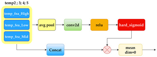 Following this, each temp undergoes a scale-awareness attention mechanism, as shown in Figure 4. The temps are first subjected to average pooling to compress the features and reduce the parameter count. Subsequently, they are connected to a fully connected layer (replaced by a 1 × 1 convolution), followed by a ReLu activation layer, and finally, a hard sigmoid activation layer to expedite training. Essentially, it assigns weights to feature layers at different levels, allowing the model to adaptively blend features based on the importance of features at that level.