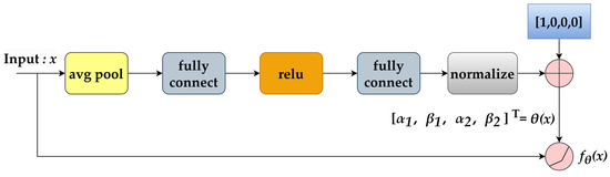 Finally, there is the task-aware module, as shown in Figure 5, which adapts to the detection task by activating channels in the feature mapping to enhance performance. The specific process involves reducing the feature dimension of input feature x through average pooling, followed by two fully connected layers and a normalization layer to map the feature space to the range of [–1, 1]. The functions implemented by these operations are similar to a hyper function θ(x) to generate four learnable parameters α1, β1, α2, and β2 for subsequent calculations [35]. Lastly, the activation function fθ(x) is used to dynamically activate different channels of the input feature x, resulting in the final output of the task-aware block. More detailed information about the hyperfunction θ(x) and activation function fθ(x) can be found in the literature [36].
