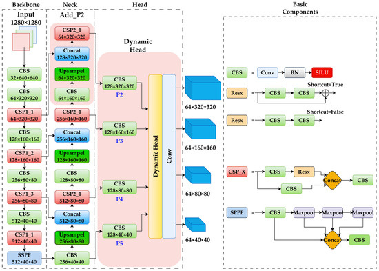 Expanding on the previously discussed enhancements, we introduced a unified object detection head framework named “DyHead” into the head network. DyHead integrates three distinct self-attention mechanisms: scale-awareness, spatial-awareness, and task-awareness [34]. In this study, the PANet structure in the YOLOv5 neck was removed because the spatial-awareness module relies on feature fusion, and only the FPN (Feature Pyramid Net) structure was retained, simplifying the model structure and preventing information loss caused by downsampling.