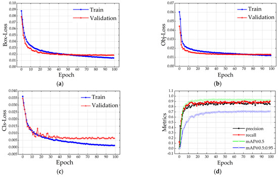 Figure 8 shows the changes in model metrics and losses after 100 training epochs. It is evident that during the initial 20 epochs of training, the model exhibited rapid convergence. This phase was characterized by substantial reductions in location loss, object loss, and class loss for both the training and validation datasets, along with a notable increase in model precision and recall. However, after 50 epochs, the model’s progress began to stabilize. To ensure optimal model performance, an early stopping strategy was used [40]. The training process was concluded at the 100th epoch. Specifically, we saved the model that achieved the highest sum of precision, recall, mAP@0.5, and mAP@0.5:0.95 scores. These scores were weighted using coefficients (0, 0, 0.1, and 0.9) to prioritize critical metrics.