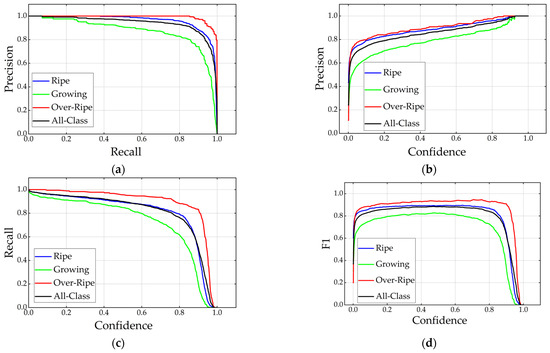 Figure 9 illustrates the results of evaluating our improved model using the test dataset. Figure 8a represents the PR curve of the model at an IoU threshold of 0.5, and the area enclosed by the curve is the Average Precision (AP). The AP values for different categories of flower buds are as follows: growing: 86.9%, ripe: 96.1%, over-ripe: 98.7%. Notably, the model achieves the highest detection precision for over-ripe buds, which is attributed to their fully open state, distinct yellow color, and high contrast with the background. In contrast, growing buds, surrounded by leaves and with a color similar to the background, exhibit relatively lower detection performance. Ripe buds, characterized by a pale yellow color and plump morphology, perform well in terms of detection. Figure 8b–d represents precision, recall, and F1 curves at different confidence levels, respectively. These curves collectively reveal the model’s excellent performance on the test set, indicating strong fitting and generalization capabilities for all three maturity levels of cabbage. Examples of six detection results are shown in Figure 10, only a few targets of growing were missed (blue circle in Figure 10a,c), and the rest were detected correctly, indicating that the model performs well.
