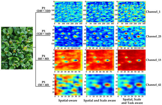 It can be observed that after adding the P2 detection layer to the FPN structure, the recall rate increased by 1.0%. The P2 detection layer only undergoes a 4× down-sampling, making it more sensitive to small object detection, resulting in more true positives being correctly detected. However, it also leads to many false-positive targets, causing a slight decrease in precision. After incorporating the spatial aware attention mechanism, all model metrics showed a significant improvement, with a direct increase of 3.9% in mAP@0.5. With the addition of scale awareness and task awareness, the model metrics further improved, although to a lesser extent. This suggests that the spatial awareness module played a dominant role [34]. Ultimately, the model’s performance improved by 3.0%, 4.6%, and 5.2% compared to the baseline model when all three attention mechanisms were combined. To provide a more intuitive demonstration of the effectiveness of each attention module, we conducted visualizations of the feature maps of the same channel after the action of each module, as shown in Figure 11. It is clearly visible that the P2 detection layer contains more small targets. After passing through each attention module, the target features are enhanced, demonstrating the effectiveness of the improvement.