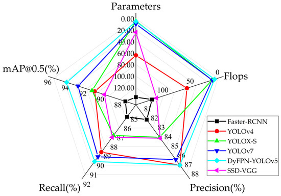 To further verify the performance of the improved algorithm in Chinese flowering cabbage bud detection, we trained five typical object detection algorithms: SSD, Faster R-CNN, YOLOv4, YOLOX-s, and YOLOv7, and conducted comparative experiments using the same dataset. Several performance metrics were used, including precision, recall, parameters, flops, and mAP@0.5. The results are summarized in Table 5. Faster-RCNN is a typical two-stage object detection algorithm with the largest number of parameters and computational requirements and exhibits the poorest performance. The other algorithms are one-stage detection algorithms. SSD shows relatively weak performance in detecting small objects [42]. YOLOv4, YOLOX, and YOLOv7 are algorithms from the same YOLOv5 family and perform reasonably well, but they are all slightly inferior to our proposed FPNDyH-YOLOv5. A more intuitive comparison can be seen in Figure 12, which clearly illustrates that FPNDyH-YOLOv5 outperforms other algorithms across various metrics while also having the smallest number of parameters and computational requirements.