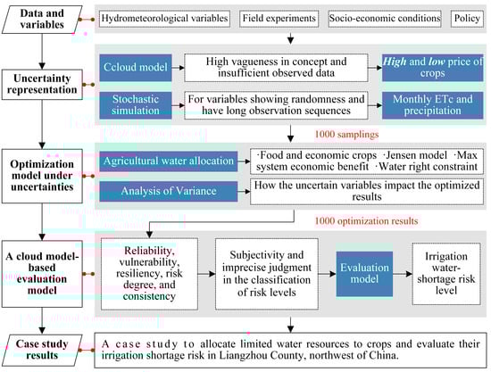 Framework of this study. This study makes use of hydrometeorological, field, socioeconomic, and policy data. We consider multiple uncertain variables represented by the cloud model and the stochastic method. The optimization model was built to allocate the limited water resources for the maximum economic benefit. We further evaluated the irrigation shortage risk. We applied the above framework to a case study in a typical arid region in China.