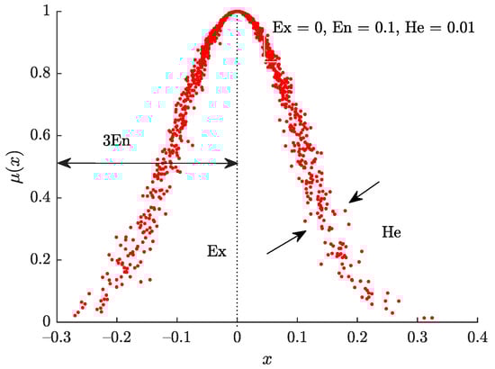 The cloud model is a method for transforming uncertainty between qualitative concepts and their quantitative expressions []. It was first proposed by Li et al. [], and a brief introduction of its concept is detailed as follows.