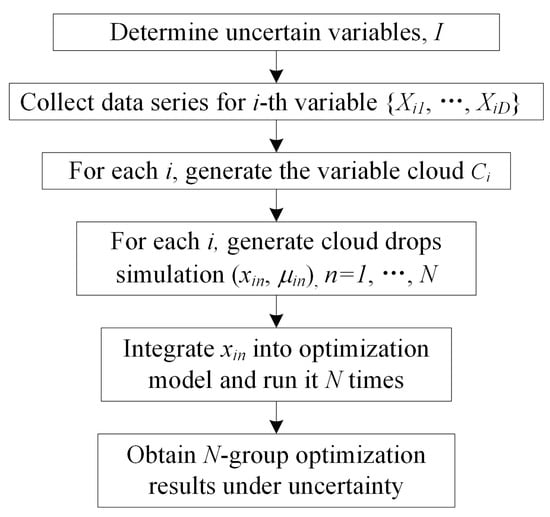 The flow chart for applying the cloud model for uncertainty representation and combining it with the optimization model. The detailed description is shown in Section 2.2.