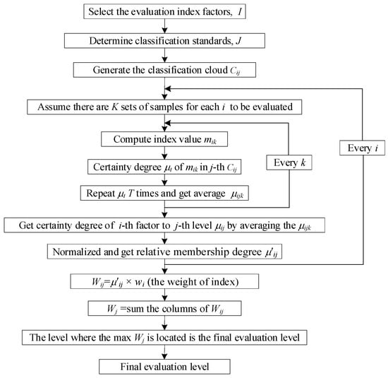 The flow chart for applying the cloud model for the evaluation method amid uncertainty. The detailed description is shown in Section 2.3.
