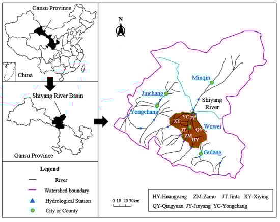 Our case study focuses on a typical arid region, specifically Liangzhou County, located in the middle of the Shiyang River Basin (101°41′–104°16′ E and 36°29′–39°27′ N), China, shown in Figure 5. Liangzhou County experiences a typical inland arid climate, with an average annual precipitation of 158 mm and potential evaporation reaching 2021 mm. Agriculture is the primary industry in the Shiyang River Basin; heavily reliant on irrigation. However, unregulated water use has led to ecological challenges downstream, including a decline in groundwater levels, lake drying, and increased desertification.