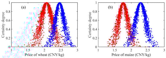 Plotted are the certainty degree for wheat (a) and for maize (b) as a function of their respective price, shown in “blue” for high and in “red” for low.
