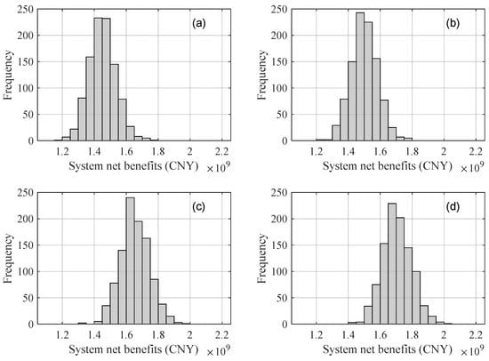 Frequency of system net benefits in four scenarios: (a–d) represent four scenarios of low prices of wheat and maize, high-price wheat–low-price maize, low-price wheat–high-price maize, and high prices of wheat and maize, respectively.