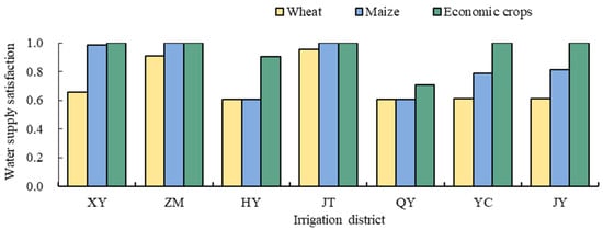 Water supply satisfaction after optimization during the whole growing period for each irrigation district and each crop.