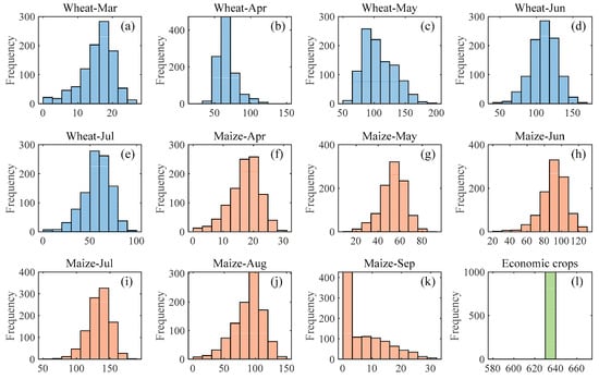 Frequency of optimized irrigation amounts for each crop, taking the XY district and scenario 1 as an example: (a–e) are for wheat, (f–k) are for maize, and (l) is for economic crops.
