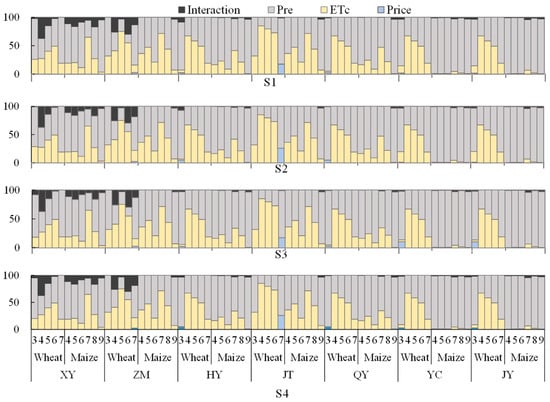The contribution of variable uncertainty to variation in optimized irrigation schemes. The contribution of precipitation (Pre), crop evapotranspiration (ETc), crop prices, and their interactions are in grey, yellow, blue, and black, respectively. S1 to S4 are the four price scenarios, representing low-price wheat–low-price maize (S1), high-price wheat–low-price maize (S2), low-price wheat–high-price maize (S3), and high-price wheat–high-price maize (S4).
