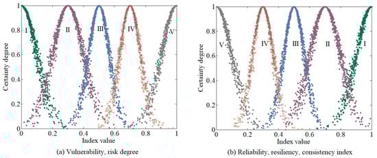 Classification clouds of evaluation levels I to V for each factor: reliability, vulnerability, resiliency, consistency index, and risk degree.