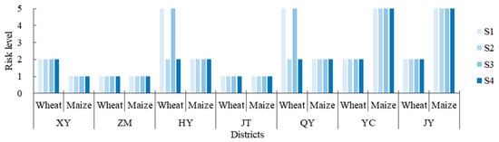Irrigation water shortage risk evaluation results. The ordinates 1, 2, 3, 4, and 5 in the figure represent water shortage risk levels I, II, III, IV, and V, respectively. S1 to S4 are four price scenarios, representing low-price wheat–low-price maize (S1), high-price wheat–low-price maize (S2), low-price wheat–high-price maize (S3), and high-price wheat–high-price maize (S4).