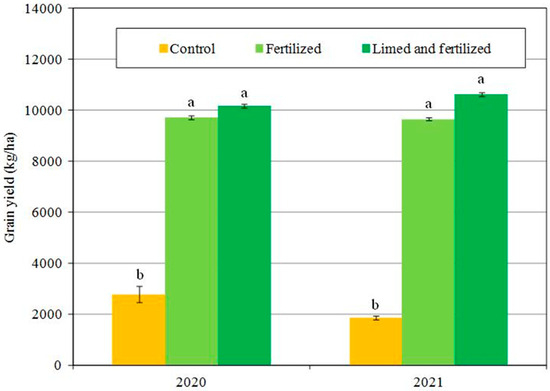 The maize grain yield in the two seasons was affected by the treatment. In both years the lowest yield was recorded on the control treatment. The average yield was 2780 kg∙ha−1 in 2020, and 1860 kg∙ha−1 in 2021. The applied mineral fertilizers significantly increased the yield compared with the control to 9723.3 kg∙ha−1 in 2020 and 9663 kg∙ha−1 in 2021. The yield was the highest when mineral fertilizers were applied together with lime, 10,170 and 10,616 kg∙ha−1, in 2020, and 2021, but there were no statistically significant differences among fertilized treatments (Figure 1). The yield in limed treatment in 2021 was 9.0% higher than the fertilized treatment, whereas a change of 4.4% was found in 2020.