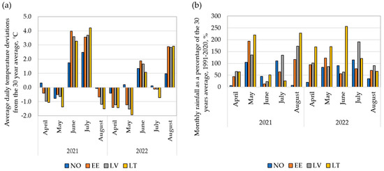 Meteorological parameters at the field trial locations (NO—Norway, EE—Estonia, LV—Latvia, LT—Lithuania) and seasons (2021, 2022) compared to 30-year long-term average (LTA) data (1991–2020): (a) deviation from the mean daily temperature from LTA; zero values on the y-axis represent the LTA; (b) monthly rainfall as a percentage of the LTA; 100% on the y-axis represents the LTA.