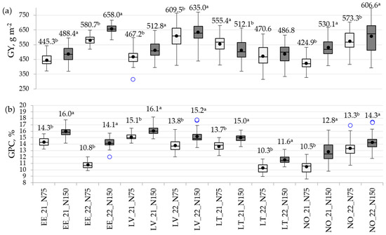 Boxplot showing the phenotypic distribution of (a) grain yield (GY) and (b) grain protein content (GPC) for 16 spring wheat genotypes grown in 16 environments. The black horizontal line in each boxplot is the median, the lower and upper box edges are the first and third quartiles, respectively, and the whiskers are the data minimum and maximum. The black circle in each plot is the mean for that class. Outliers are shown as open circles; EE—Estonia, LV—Latvia, LT—Lithuania, NO—Norway; 2021 and 2022—year of trials; N75—N rate with 75 kg N ha−1; N150—N rate with 150 kg N ha−1; a, b—significant differences (p < 0.05) between the mean values of two N rates within each location and year are shown by different superscript letters.