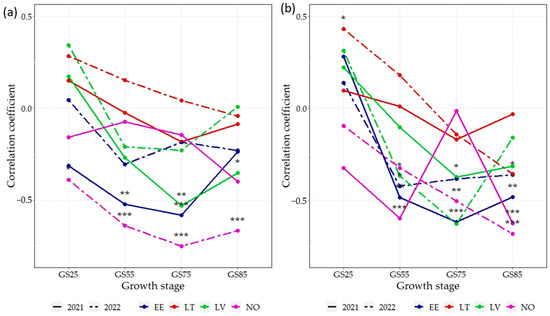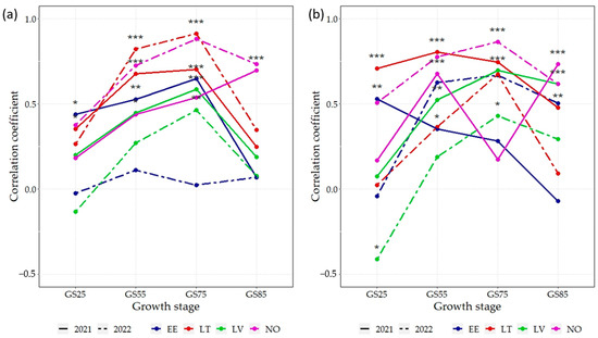 Correlation coefficients (r) between the NDVI and grain yield across 16 spring wheat genotypes grown under two N rates: (a) 75 kg N ha−1, (b) N150—150 kg N ha−1 in eight environments; EE—Estonia, LV—Latvia, LT—Lithuania, NO—Norway; NDVI—normalized difference vegetation index; GS25—tillering growth stage; GS55—heading growth stage; GS75—milk growth stage; GS85—dough growth stage; *** p < 0.001; ** p < 0.01; * p < 0.05.