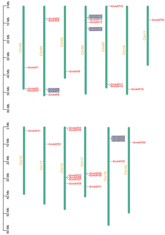 According to the chromosomal locations, the 36 GmAAPs were identified on thirteen chromosomes and distributed unevenly (Figure 1). No GmAAPs were identified in the remaining seven chromosomes 1, 3, 7, 9, 15, 16, and 20. Specifically, chromosome 6 contained the largest number (6) of GmAAP members, followed by chromosomes 4 (5) and 18 (4), and chromosomes 2, 8, and 17, each containing three GmAAP genes. The rest of the chromosomes contained only one GmAAP gene. Interestingly, nine AAP genes were distributed in tandem on three chromosomes, including GmAAP6 and GmAAP7 on chromosome 4, GmAAP10 and GmAAP11 on chromosome 6, GmAAP14 and GmAAP15 on chromosome 6, and GmAAP32, GmAAP33 and GmAAP34 on chromosome 18. These findings are similar to those observed in wheat with twenty-six tandemly duplicated AAP members, and in rice with ten tandemly duplicated AAPs [12,44].
