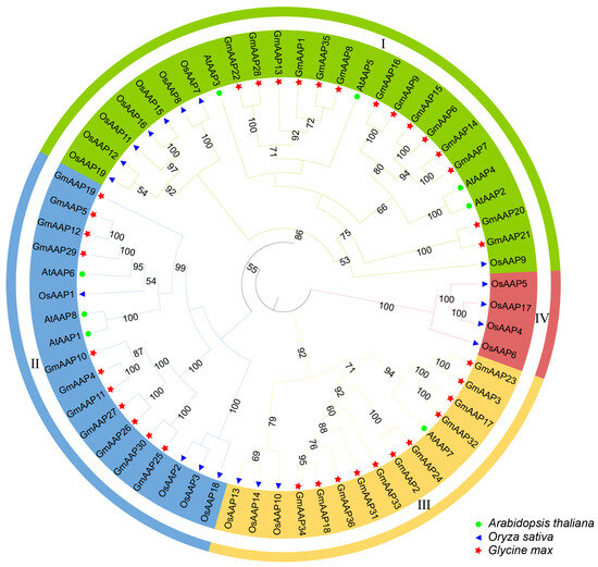 Phylogenetic trees of 63 AAPs in three species. All AAP protein sequences were downloaded from Phytozome v13. The tree was conducted based on the full-length amino acid sequences using MEGA 11 by the neighbor-joining method with 1000 bootstrap replicates. Bootstrap values are shown in percentage terms on the branches. Bootstrap values (1000 repetitions) less than 50 are not shown. The 63 AAP proteins were divided into four groups according to the topology. Group I—green region, containing 13 GmAAPs, 8 OsAAPs, and 4 AtAAPs. Group II—blue region, containing 11 GmAAPs, 4 OsAAPs, and 3 AtAAPs. Group III—orange region, containing 11 GmAAPs, 3 OsAAPs, and 1 AtAAP. Group IV—red region, containing 4 OsAAPs. Stars represent AAPs from soybeans, triangles represent AAPs from rice, and solid circles represent AAPs from Arabidopsis.