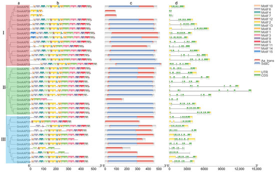 Conserved motif, domain, and gene structure of the soybean AAP gene family. (a): According to the phylogenetic relationships, the GmAAP proteins clustered into three major phylogenetic subgroups (I, II, III). (b): The putative conserved motifs, motifs 1–15, are represented by different colored boxes at the top of the figure. (c,d): domains and the exon/intron structures in GmAAP genes are shown, respectively, from left to right in the figure. The relative position and size of the domain and exon can be estimated using the scale at the bottom. Red roundrect, blue roundrect, yellow boxes, and green boxes represent the domain Aa_trans, the domain Sdac, UTR, and exons, respectively.