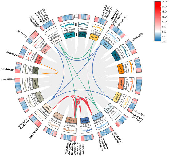 Analysis and illustration of collinearity of the soybean AAP gene family. The colored lines in the inner circle represent 26 homologous gene pairs. I—20 assembled chromosomes of soybean; II—GC ratio line map; and III—gene density heatmap. Red lines indicated high gene density in the chromosomes, and blue lines indicated low gene density in the chromosomes. The different colored lines instruct AAP syntenic regions on the GmAAP gene family. All GmAAP genes were shown in the outermost ring, and bold font indicated collinear genes. The gray line represented other gene syntenic regions in the soybean genome.