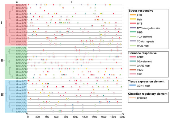 Predicted cis-regulatory element in the 2000 bp region upstream of the start codon (ATG) of each GmAAP gene. (a): The phylogenetic tree of the GmAAP genes. The phylogenetic tree was clustered into three groups (I, II, III) (b): Cis-regulatory elements are represented with colored boxes. The scale below the figure indicates the relative position of each cis-element relative to the start codon, ATG. These elements were divided into four types including stress-responsive elements (LTR, MBS, MYB-related components, TC-rich repeats, the TCA-element, and WUN-motif), hormone-responsive elements (ABRE, ERE, GARE, P-box, and the TGA-element), the tissue expression element (GCN4-motif), and the circadian regulatory element (circadian).