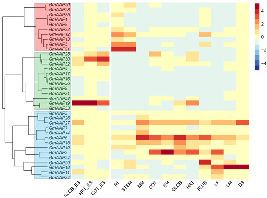 Expression pattern of the GmAAP genes in different tissues. The data were obtained from the RNA-Seq data (seedgenenetwork.net, accessed on 26 October 2023). The heatmap was executed by the R package pheatmap version 1.0.12. Different colors in the heatmap represent gene relative expression levels, as shown in the scale bar at the top right of the figure. Abbreviations: RT—roots; STEM—stems; LF—leaf; FLUB—floral bud; GLOB—globular stage; HRT—heart stage; COT—cotyledon stage; EM—early maturation stage; MM—mid-maturation stage; LM—late maturation stage; DS—dry seed; GLOB_ES—globular stage endosperm; HRT_ES—heart stage endosperm; COT_ES—cotyledon stage endosperm.