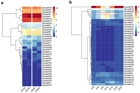 (a) Expression profiling of the GmAAP genes in soybean roots under CK (normal N, 7.5 mM) and LN (low N, 0.75 mM) conditions at 12 h and 24 h after treatment. (b) Expression pattern of the GmAAP genes in the circadian time course of soybean unifoliolate leaves. The data were downloaded from the NCBI database (https://www.ncbi.nlm.nih.gov/bioproject/PRJNA369113, accessed on 26 October 2023) and reanalyzed to obtain the transcriptome of Williams 82 under constant light conditions. ZT—Zeitgeber time. The red dotted boxes indicate that the genes with circadian elements are regulated by circadian rhythm. The heatmaps were executed by the R package pheatmap version 1.0.12.