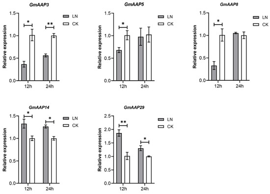 To verify the results, we examined the expression levels of five genes (GmAAP3, GmAAP5, GmAAP8, GmAAP14, GmAAP29) which showed differential expression in the transcriptomic data using quantitative RT-PCR (qRT-PCR), with RNA samples utilized in RNA-Seq. Primers for qRT-PCR are shown in Table S1. Overall, we observed that three of the selected GmAAPs were significantly downregulated approximately two-fold (by 1.48–3.06 times) after LN stress (Figure 8), of which, GmAAP3 consistently showed downregulation during both 12 h and 24 h after LN stress compared with NN (normal N). GmAAP5 and GmAAP8 displayed significant downregulation at 12 h only, suggesting that both genes might be important during early response. In contrast, GmAAP14 and GmAAP29 were both consistently upregulated significantly after LN at 12 h and 24 h. The qRT-PCR verified the transcriptomic results, suggesting that those with consistent changes in expression during LN treatment might play important roles in LN response, and merit further investigation.
