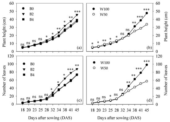 Specifically, a significant effect of B on the plant height (PH) (Figure 1a) was observed starting from 28 until 45 DAS when the B2-treated plants were clearly differentiated from the B0- and B4-treated ones, where they always showed a higher PH value. Instead, W affected the PH earlier (Figure 1b). Indeed, from 18 to 28 DAS, the W50-treated plants always showed a higher PH value than W100-treated ones. In particular, a 20% PH increase was observed at 23 DAS. This PH response to the water regimes reversed in the final part of growing cycle, with 23, 35 and 41% higher PH values obtained for the W100-treated plants compared to the W50-treated plants at 38, 41 and 45 DAS, respectively.