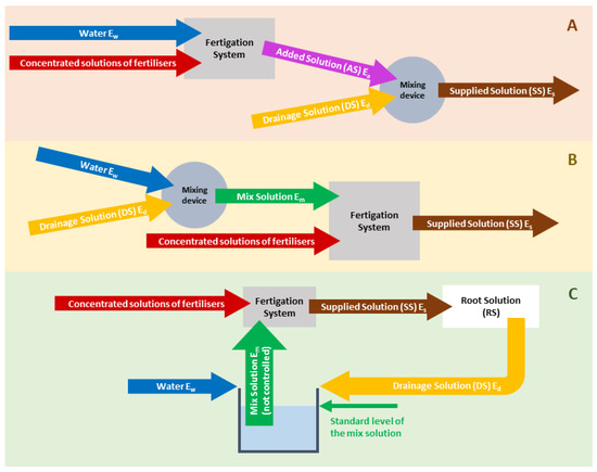 In both open and closed-loop SCSs, the NS that is ultimately supplied to the crop is termed supplied solution (SS). In substrate-grown crops, when the plants are irrigated through a drip irrigation system, the SS is frequently referenced as a “drip solution”. In open SCSs (Figure 1A), the SS is simply prepared by injecting liquid stock solutions of fertilisers into irrigation water at rates resulting in a pre-set electrical conductivity (EC) in this, using suitable equipment termed “fertigation system” (FS). In CLSs (Figure 1B), the SS is prepared by mixing raw water, stock solutions of fertilisers, and DS at suitable rates. In CLSs, the masses of plant nutrients added through the fertilisers and the volume of raw water added to the DS to prepare SS correspond to specific nutrient-to-water rations, which are considered concentrations of a solution termed added solution (AS) [8]. The AS constitutes the net input of nutrients and water to the SS, while the DS provides nutrients and water to the SS that are already in the system.