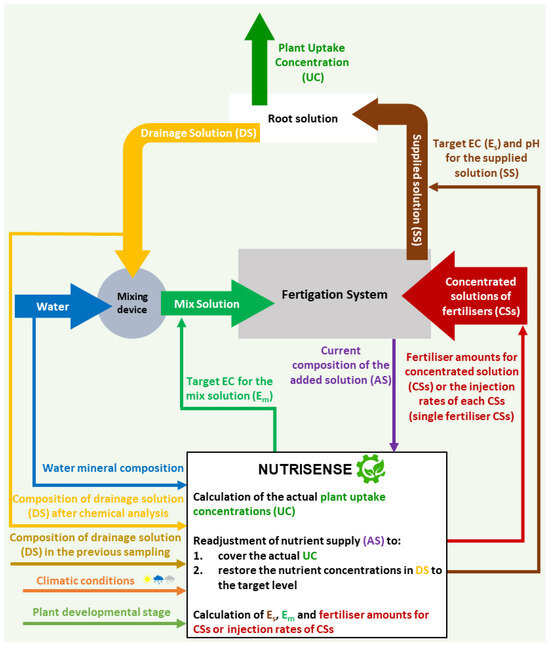In Figure 1, the parameters involved in the supply of NS to soilless cultivations in both open and closed systems and the relevant terminologies are schematically outlined.