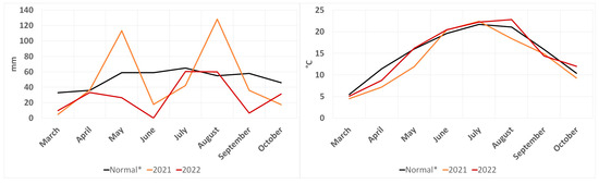 The field experiment was conducted in 2021 and 2022 at the experimental station of Slovak University of Agriculture (SUA) in Nitra (E 18°09′, N 48°19′). This location belongs to a temperate area; the Zobor Mountains are in the near vicinity, and the river Nitra flows nearby. Based on its climatic conditions, it can be concluded that the location is warm and dry. Figure 1 shows the temperature and rainfall during the experiment as compared with a 30-year climatic normal. Data were recorded using hydro-meteorological station directly at the experimental base. The soil at the experimental plot was classified as haplic luvisol, and the soil texture was classified as silt loam.