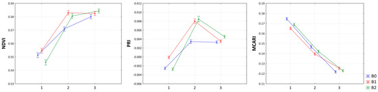 Progress of normalized difference vegetation index (NDVI), photochemical reflectance index (PRI), and modified chlorophyll absorption in reflectance index (MCARI) according to date of biostimulant treatments. On the x-axis, 1 represents measurements before biostimulants treatment, 2 represents measurements after first biostimulants treatment, and 3 represents measurements after second biostimulants treatment.