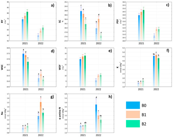 Despite the fact that the interaction year × treatment did not have a significant effect on the root yield (Table S1), the results indicate that the application of biostimulants had a positive effect both in favorable and less favorable conditions throughout the studied years (Figure 4a). In both years, the highest RY values were achieved in treatment B2. However, an interesting finding was provided by the results of the sugar content depending on the year × treatment interaction (Figure 4b). Although the significantly highest value of SC was detected in the interaction 2021 × B0, an important finding was the increase of SC in treatment B1 in 2022, with a significant difference compared to the other treatments. This indicates a high potential for the use of pure Ascophyllum nodosum algae extract in sugar beet production under unfavorable conditions, while the mineral component in the B2 treatment probably resulted in a decrease in sugar content. The results of PSY and WSY largely followed the trend in RY, with a statistically insignificant effect of the interaction year × treatment. However, significant differences between treatments were found in terms of WSC, the highest value being found in the 2021 × B0 interaction (Figure 4d). In connection with the content of compatible solutes, a significant influence of the interaction year × treatment was found. However, significant variability was recorded especially in the year 2022, while in 2021, the differences were minimal (Figure 4f–h). In general, however, it can be concluded that treatments with biostimulants within the year × treatment interaction had a more positive effect on the content of α amino N, while increases in the content of K+ and Na+ were recorded especially in the case of B1 treatment.