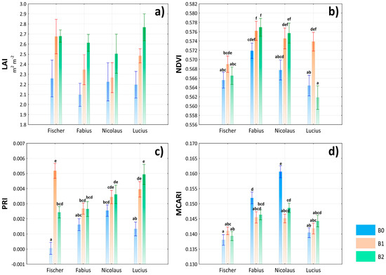 Evaluation of leaf area index (LAI) (a), normalized difference vegetation index (NDVI) (b), photochemical reflectance index (PRI) (c) and modified chlorophyll absorption in reflectance index (MCARI) (d) depending on the interaction of variety × treatment. Lowercase letters above bars denote a significance of difference at probability level α = 0.05. In bars without lowercase letters, there is no significance of difference. Vertical bars denote +/− standard errors.