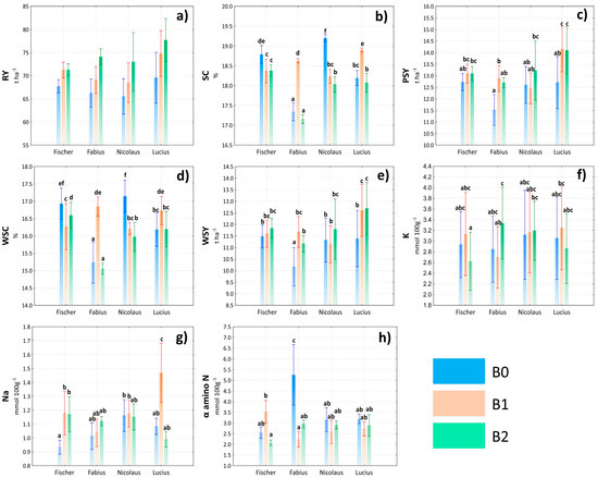 Evaluation of root yield (RY) (a), sugar content (SC) (b), polarized sugar yield (PSY) (c), white sugar content (WSC) (d), white sugar yield (WSY) (e), potassium content (K) (f), sodium content (Na) (g), and α amino nitrogen content (α amino N) (h) depending on the interaction of variety × treatment. Lowercase letters above bars denote a significance of difference at probability level α = 0.05. In bars without lowercase letters, there is no significance of difference. Vertical bars denote +/− standard errors.