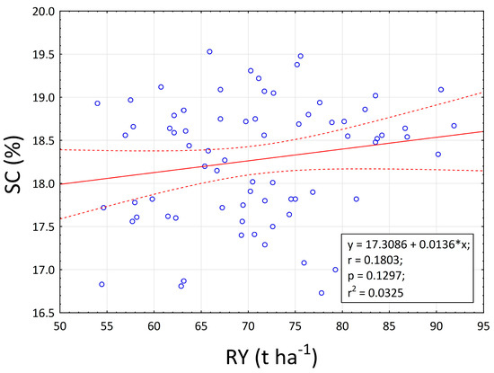 Relationship between root yield (RY) and sugar content (SC). The linear relationship between parameters is represent by solid lines. The confidence band at 95% is representing by dot lines. The circles in the figure representing data points. Linear equations, correlation coefficient, probability, and regression are inserted inside figures.
