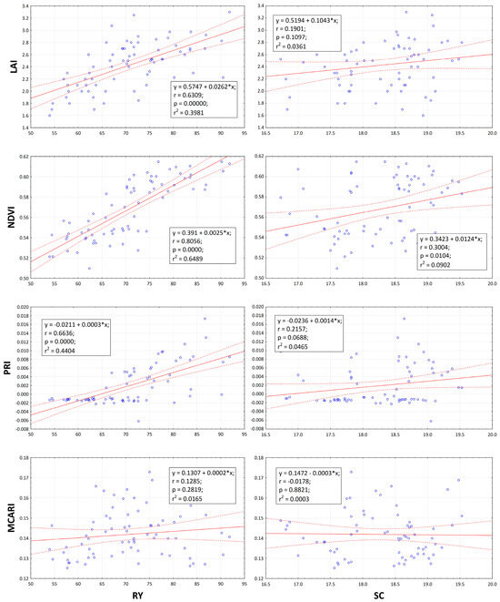 Root yield (RY; t ha−1) and sugar content (SC; %) relationships towards leaf area index (LAI m2 m−2), normalized difference vegetation index (NDVI), photochemical reflectance index (PRI), and modified chlorophyll absorption in reflectance index (MCARI). The linear relationship between parameters is represent by solid lines. The confidence band at 95% is representing by dot lines. The circles in the figure representing data points. Linear equations, correlation coefficient, probability, and regression are inserted inside figures.