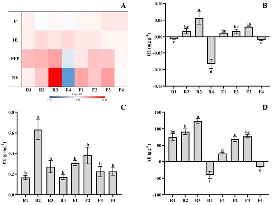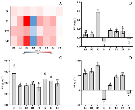 Effect of root and foliar humic substance application on nitrogen use efficiency parameters. (A) Heat map showing N concentration, IE, PFP, and NE These parameters are expressed as: mg g−1 DW (N), g g−1 (IE), g g−1 (PFP), and mg (NE). The color scale refers to the logarithmic transformation (log10) of measured values (higher values are shown in red, lower values in blue, and intermediate values in white), and it is compared to the control treatment. For the interpretation of the color code, refer to Supplementary Table S1. (B) RE, (C) PE, and (D) AE. Parameter values are expressed in relation to the control treatment. Values are expressed as means ± standard error (n = 6). Columns marked with the same letters were not significantly different based on the LSD test (p < 0.05). Abbreviations: N: nitrogen; IE: internal utilization efficiency of a nutrient; PFP: partial factor productivity of applied nutrient; NE: nutrient export of applied nutrient in shoot; RE: apparent crop recovery efficiency of applied nutrient; PE: physiological efficiency of applied nutrient; AE: agronomic efficiency of applied nutrient. R1 (0.20 mL/L), R2 (0.40 mL/L), R3 (0.60 mL/L), R4 (0.80 mL/L), F1 (5.00 mL/L), F2 (7.50 mL/L), F3 (10.00 mL/L), and F4 (12.50 mL/L).
