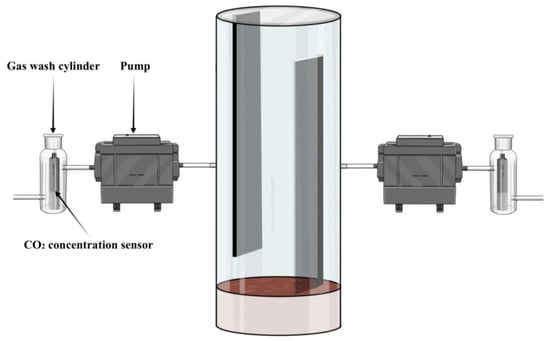 The gas wash cylinders, gas pumps, and body of the acrylic chamber are connected using a gas pipe (with an outer diameter of 6 mm and a thickness of 1 mm, made of plastic material) to form the intake module of the system; sequentially, the body of the chamber, the pump, and the gas wash cylinders with concentration sensors are connected using a gas pipe (with an outer diameter of 6 mm and a thickness of 1 mm) to form the pumping module of the system. Carbon dioxide concentration sensors are placed completely within the gas wash cylinders. The openings at the top and bottom of the gas wash cylinders ensure that the inflow of gas completely passes through the gas washing cylinder. The gas pump is connected to a gas flow meter (SMC PFM750, SMC Corporation, Tokyo, Japan) to adjust the needed flow rate during the experiment before the measurement, and the gas flow rates at the inlet and outlet are the same. Temperature and humidity sensors are installed inside and outside the chamber to monitor these environmental parameters during the field measurement.