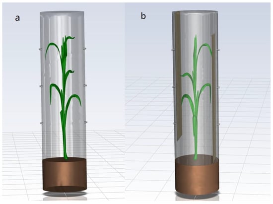 Finite element simulation modeling of the air chamber is conducted in Ansys Fluent 2020R2 software (ANSYS, Inc., Canonsburg, PA, USA). The model is established in a 1:1 ratio with the chamber sample, as shown in Figure 2. To reproduce gas diffusion, turbulence intensity, and concentration distribution conditions in the chamber as closely as possible, we add a finite element simulation model of a maize plant in the chamber. Due to the incorporation of the maize plant model, an unstructured mesh is implemented in this model. The number of meshes before adding the deflector is approximately 5 million, the minimum orthogonal quality is 2.40669 × 10−2, the number of meshes after adding the deflector is approximately 6 million, and the minimum orthogonal quality is 3.06123 × 10−2. The minimum orthogonal quality of the model mesh is closely correlated with the convergence and accuracy of the simulation results. Moreover, the minimum orthogonal quality of the worst cell is close to 0, while that of the best cell is close to 1, which indicates that our model mesh is accurate and that the simulation calculations converge more easily. The chamber bottom in the model is a porous medium with a height of 30 cm (this part of the height is calculated outside the chamber) to simulate gas emission from the surface of the agricultural soil. Figure 2 shows the two types of chamber models established in the Fluent 2020R2 software.