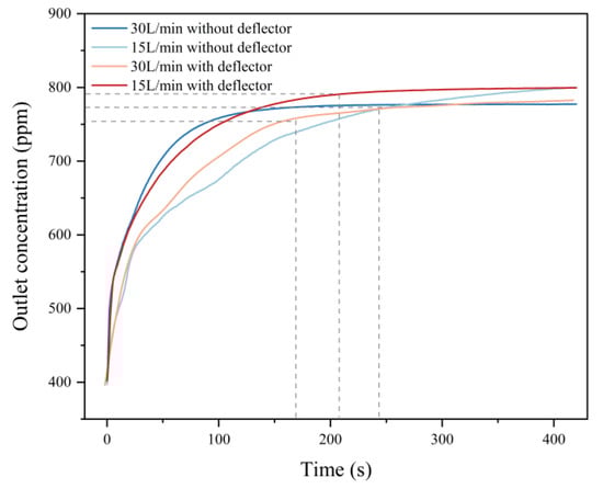 Three of the four simulation experiments reached a steady state within 420 s. The only exception was the simulation experiment with a low flow rate and no deflector. The simulation results showed that using a higher flow rate during measurements allows the chamber to reach the steady state faster, with or without the deflector; the addition of a deflector also reduced the time to reach the steady state at the same flow rate. With the addition of the deflector, the control group reached the steady state faster at the 15 L/min flow rate than the control group without a deflector at the 30 L/min flow rate. The simulation results showed that the addition of the deflector reduces the time required to reach the steady state in the flow-through chamber.