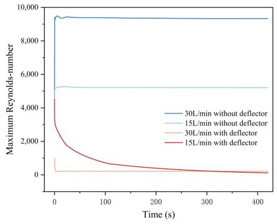 We also monitored the maximum Reynolds number inside the entire chamber during the simulation, and in the case of the simulation with the deflector, only the maximum Reynolds number in the effective measurement area between the two deflectors was monitored.