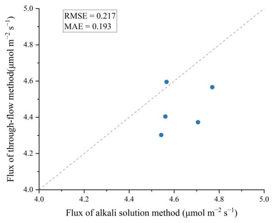 The analytical results revealed that the root mean square error (RMSE) between the flux values obtained by the alkali solution absorption method and the flow-through chamber approach is 0.217, while the mean absolute error (MAE) is 0.193. The observations indicated that in most instances, the flux values obtained using the alkali solution absorption method were slightly higher than those obtained using the flow-through chamber technique. This difference is likely attributable to the interaction between the carbon dioxide exhaled by the experimenter and the NaOH solution in the titration process, potentially leading to a deviation in the results. This result confirms the high precision of the instrument and the associated measurement technique utilized in our study.