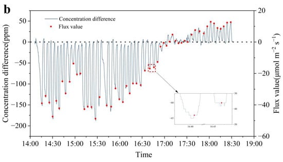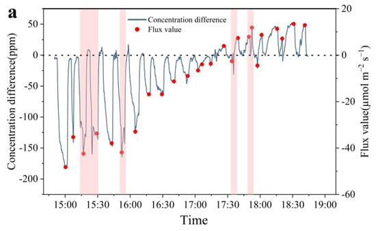 Since environmental factors such as light and temperature always affect the carbon dioxide absorbed and emitted by photosynthesis and respiration [40,41], respectively, we could not conclude that the flux results of the modified chamber are more stable, but due to the elimination of turbulence in the chamber, the curves of the concentration difference for the modified chamber were more stable than those for the nonmodified chamber. Moreover, the curves for the modified chamber were less likely to show large variations in concentration differences, such as the pink area in Figure 7a, compared to those for the unmodified chamber. In the modified chamber, gas mixing exhibited enhanced homogeneity, thereby markedly reducing the occurrence of pronounced concentration gradients akin to those depicted in the pink region of Figure 7a. This improvement could increase the precision of the resulting flux measurements.