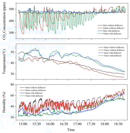 Figure 8 shows variations in the environmental factors during the measurement process. The ambient carbon dioxide concentration outside the chamber remained stable at approximately 480 ppm throughout the measurement. After the start of the measurement, the temperature and humidity in the two groups of chambers increased to different degrees after the top cover was closed. The average temperature difference between the inside and outside of the chamber without a deflector was 2.13 °C, and the average humidity difference was 11.50%. In contrast, the average temperature difference between the inside and outside of the chamber with deflectors was 1.01 °C, and the average humidity difference was 9.09%. Optimization of the chamber structure resulted in a 52.6% reduction in the mean temperature difference and a 20.1% reduction in the mean humidity difference. The reduced temperature and humidity differences observed during the measurement with the modified chamber could be primarily attributed to the increased frequency of the measurements. This higher frequency allowed for more frequent opening of the chamber top, thereby mitigating the fluctuations in the temperature and humidity. Throughout the intervals between the measurement periods, the air pumps remained operational and the chamber top cover was opened to closely align the internal chamber conditions with the external environmental factors. Significant variations in temperature and humidity could influence soil respiration and the physiological state of plants in the chamber [19]. These changes, in turn, could alter plant respiration and photosynthesis rates, subsequently impacting the precision of the measurements [42,43].